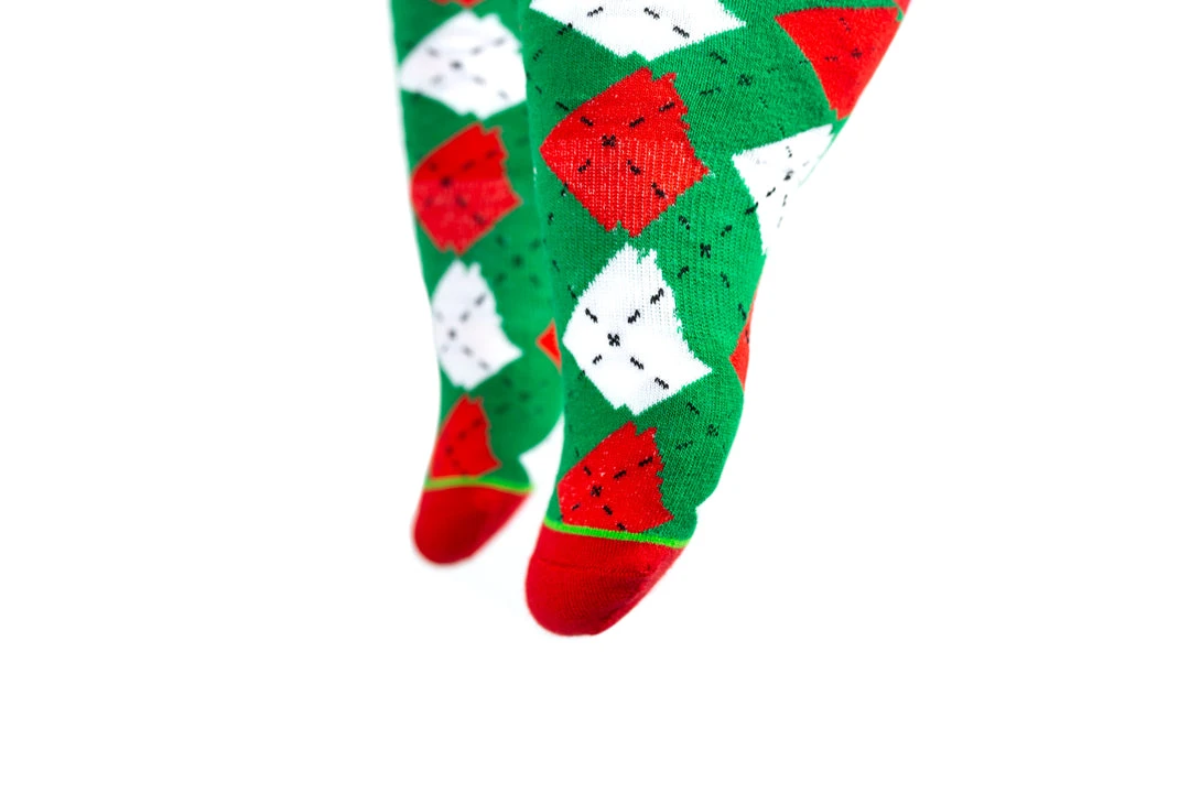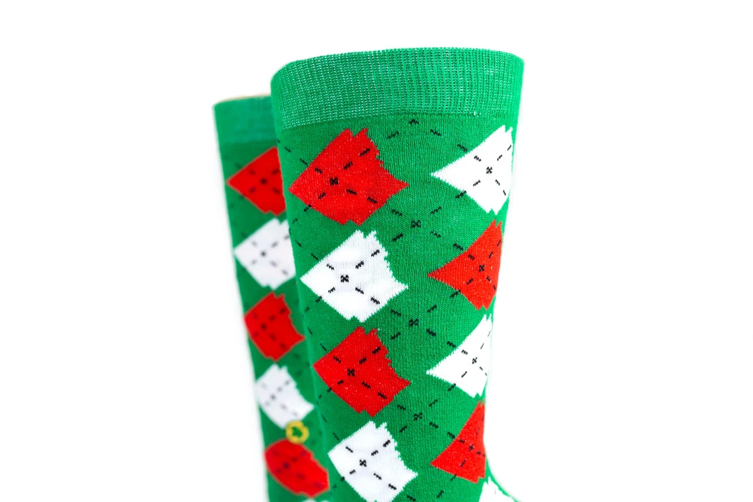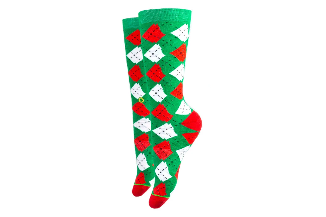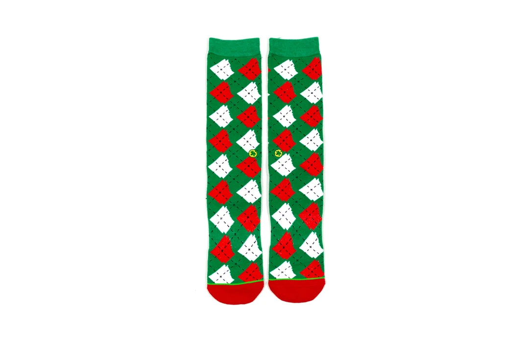 The Christmas version of our take on the classic argyle, the Argyle State of Mind sock features the state silhouette in several colors. This lightweight sock is built with Supima Cotton, a premium material used in the finest garments, breaths easily and maximum comfort. Available now in a standard size.