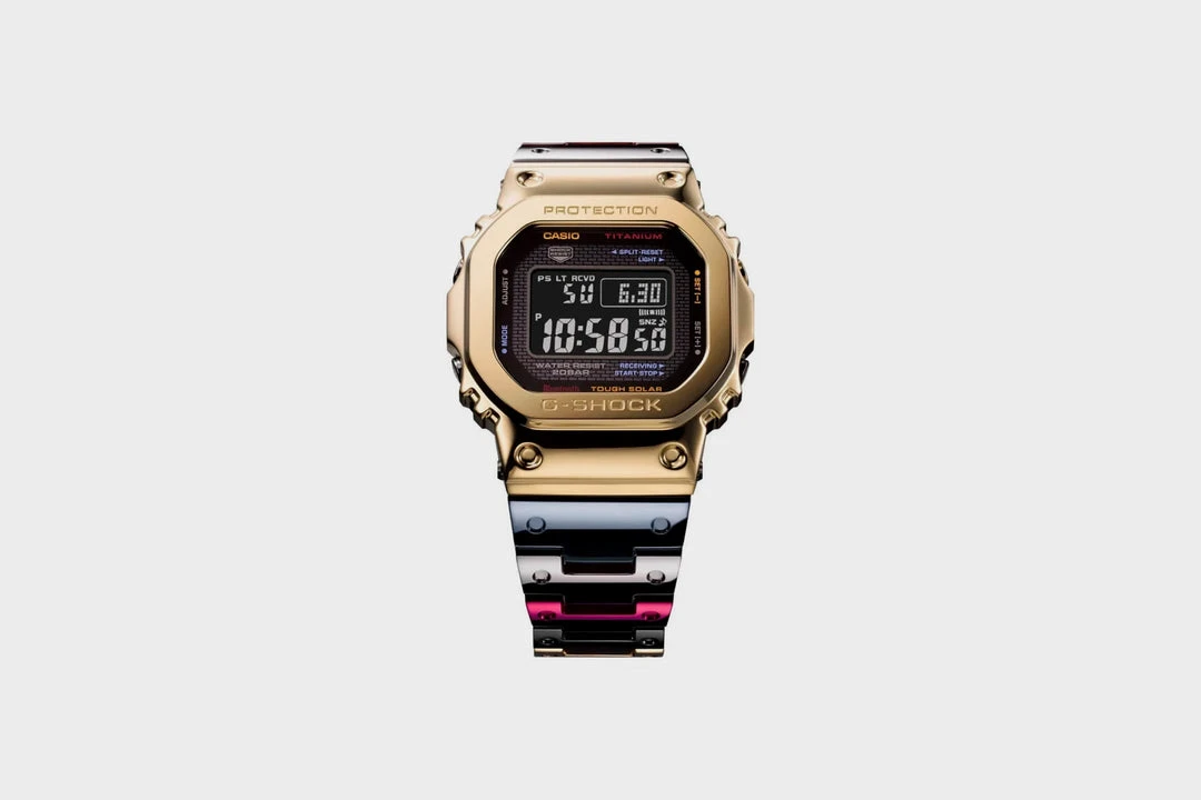 The special model GMWB5000TR-9 uses titanium material “TranTixxii,”. This titanium alloy has all the characteristics of titanium, including being light and gentle on the skin, with about twice the hardness of pure titanium. Improved hardness makes it possible to create a mirror finish comparable to that of stainless steel, making this the first titanium G-SHOCK with an all-mirror finish. The case of the watch has a gold ion-plated (IP) finish, and the band and buttons also have an IP finish in red, blue, light gray, dark gray, and gold, colors that are also used for accents on the face.