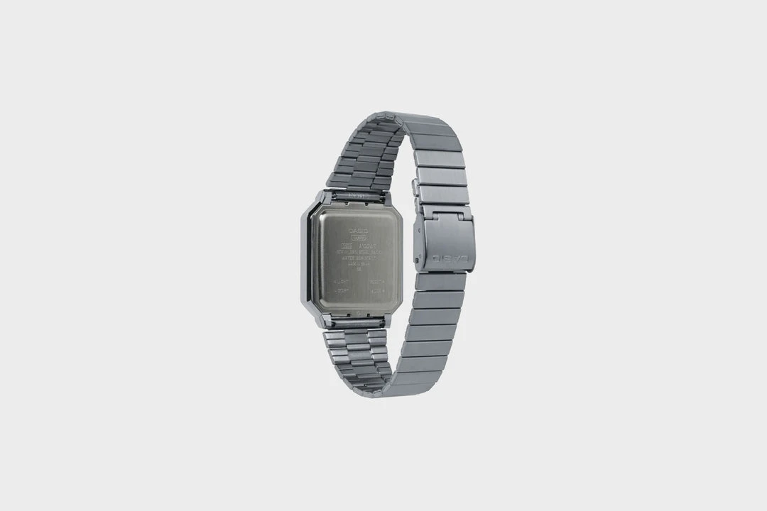 The A100 series is a reproduction of the F-100, CASIO’s first resin case model. The design has been updated for this more modern version while retaining the distinctive layout of the F-100’s four front buttons along with CASIO vintage metal elements.