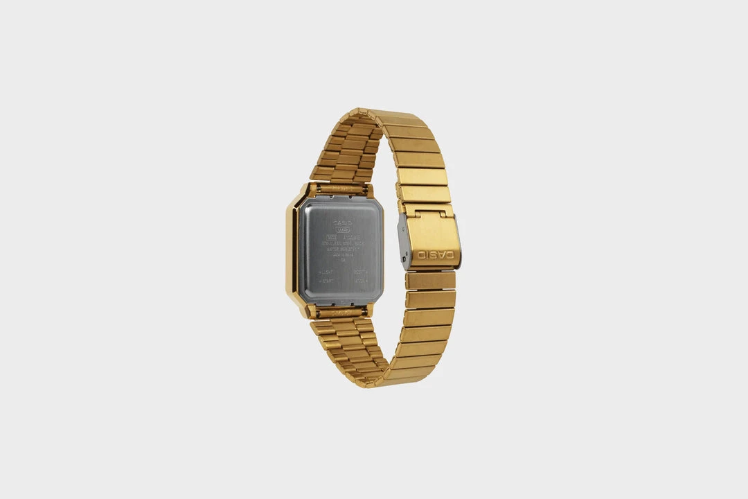 The A100 series is a reproduction of the F-100, CASIO’s first resin case model. The design has been updated for this more modern version while retaining the distinctive layout of the F-100’s four front buttons along with CASIO vintage metal elements.