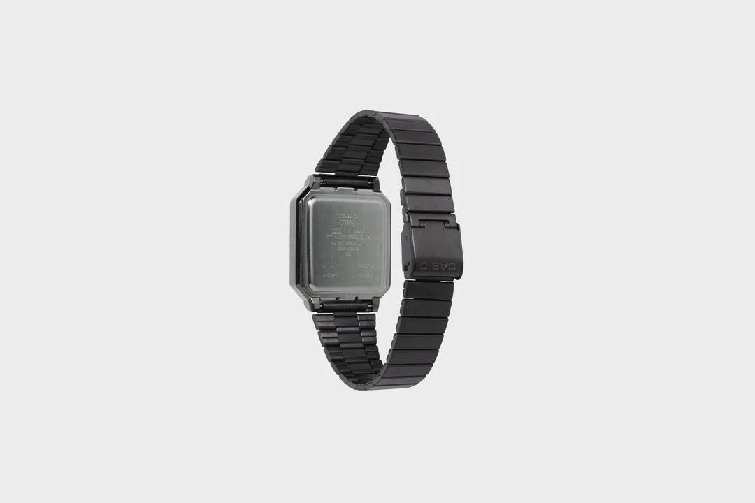 The A100 series is a reproduction of the F-100, CASIO’s first resin case model. The design has been updated for this more modern version while retaining the distinctive layout of the F-100’s four front buttons along with CASIO vintage metal elements.