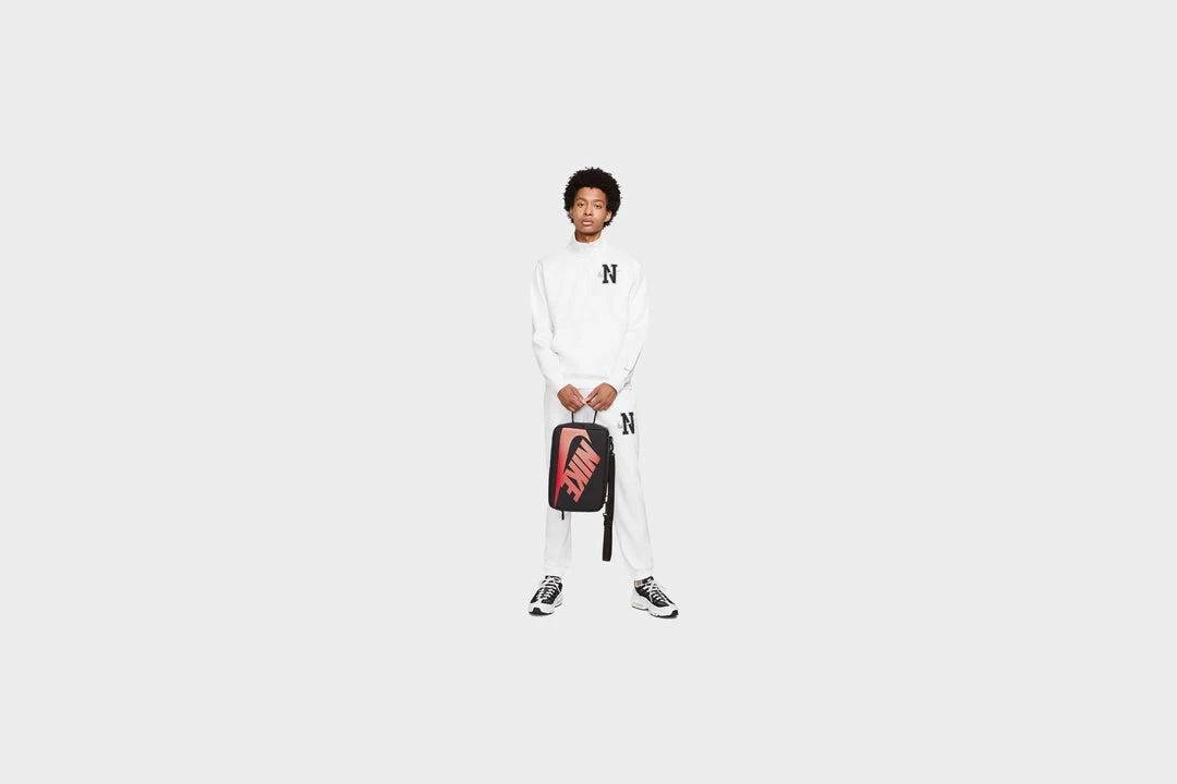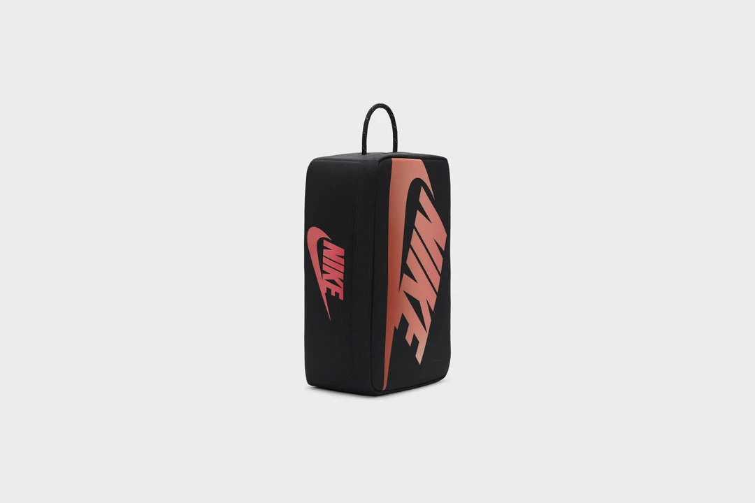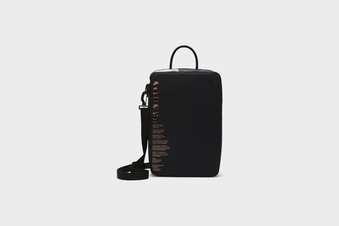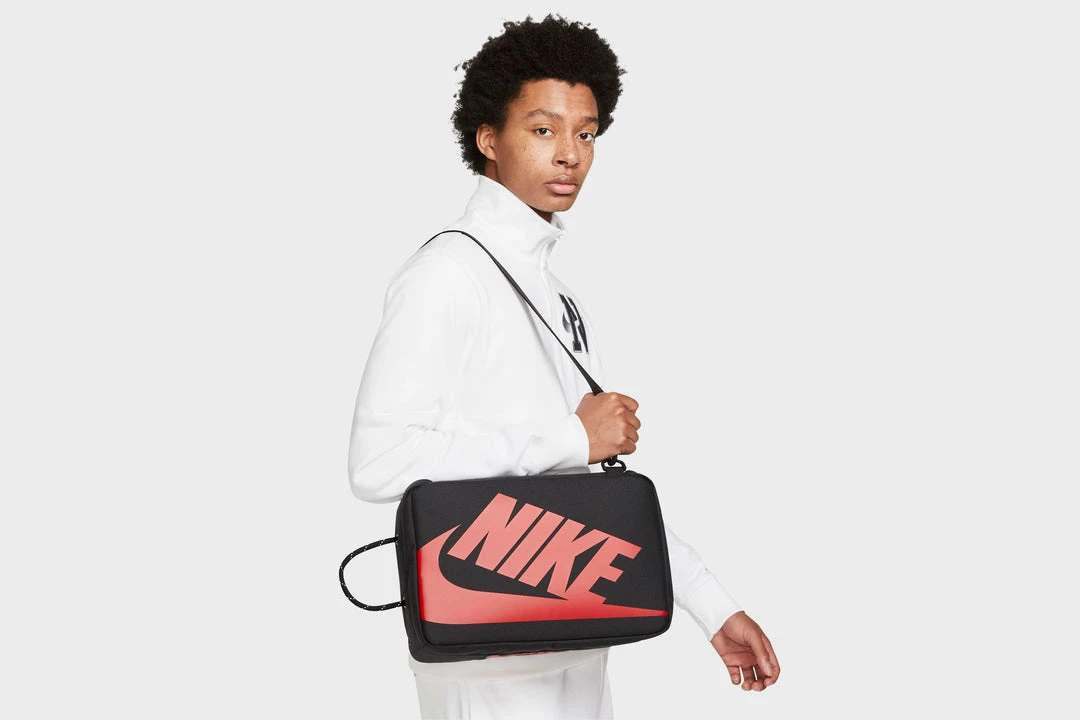 Store and carry your shoes in style with the Nike Shoe Box Bag. Made with durable materials, the main body features 2 large Nike logos, a removable crossbody strap and a true shoebox flap opening. On the inside, an internal elastic pocket and zippered mesh pocket help keep extra laces and other small items stored and organized.