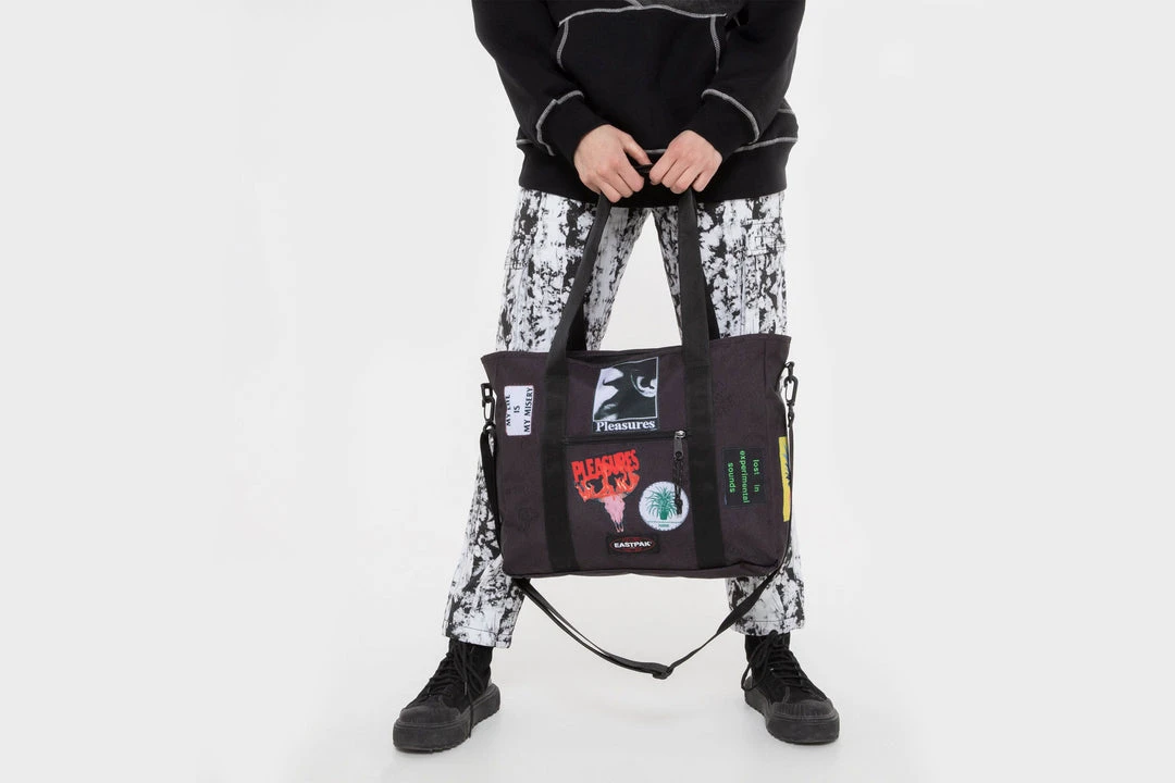 TheĀ classic Eastpak shoulder bag is reinvented in the subversive style of the LA-based streetwear brand Pleasures. This sleek and smart tote bag is reworked with Pleasures’ bright and bold graphic patches. Use the built-in laptop sleeve to protect your tech and carry it with the handles or detachable strap.