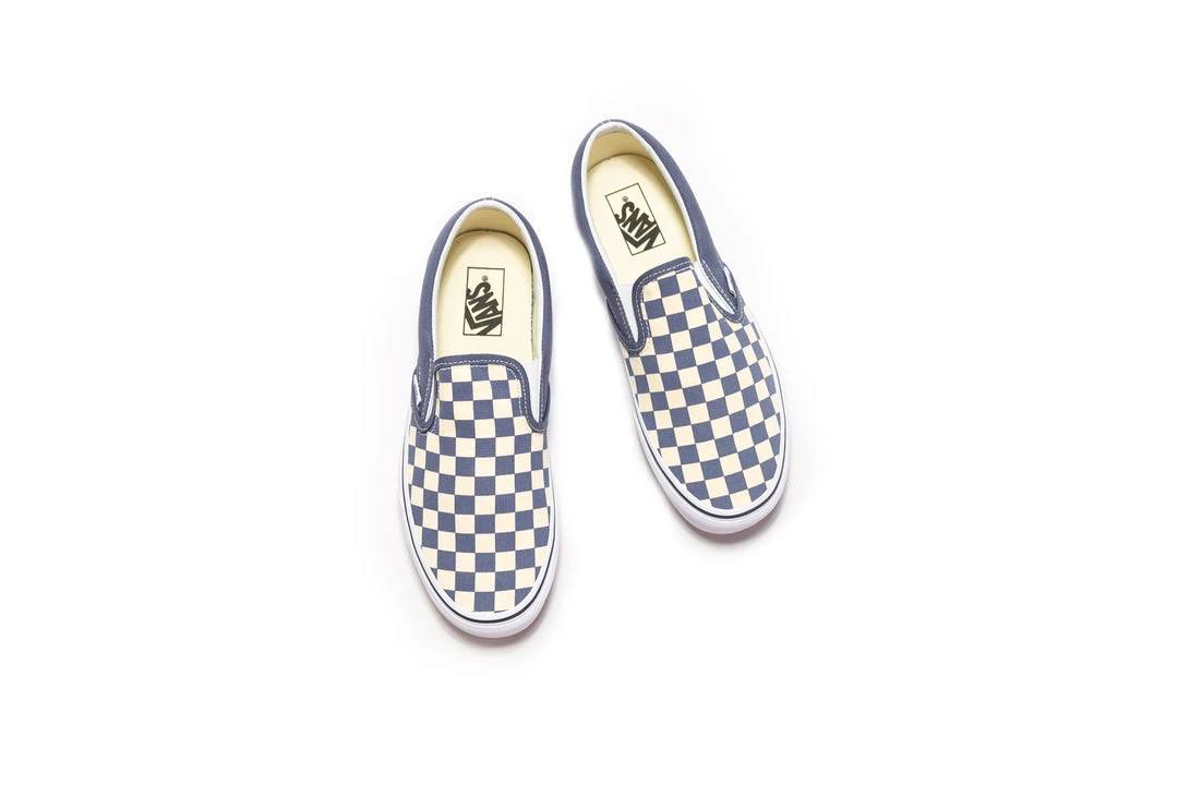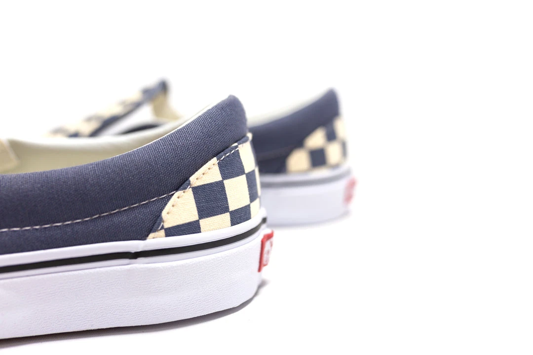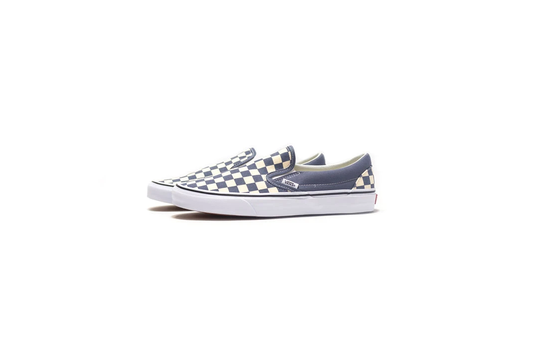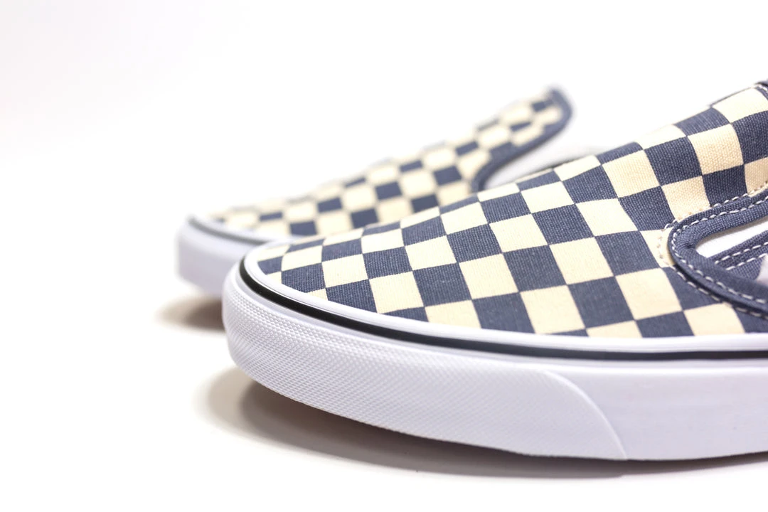 The Classic Slip-On has a low profile, slip-on canvas upper with all-over checker print, elastic side accents, Vans flag label and Vans original Waffle Outsole.